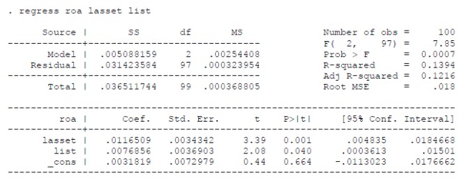 The following Stata output refers to a regression for the determinants of the return on assets for a sample of 100 banks in a particular year. The variable definitions are as follows: